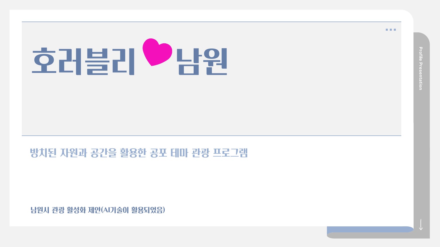 자유 『제96회 춘향제 홍보 콘텐츠 공모전』 홍보기획안-입상 강애영 댓글 0건 조회 15회 작성일 26-03-12 16:15 『제96회 춘향제 공모전』 홍보 콘텐츠 공모전(홍보기획안) 입상작을 공개합니다! 전통과 현대가 어우러진 아름다운 남원~✨ 댓글 0 등록된 댓글이 없습니다.
