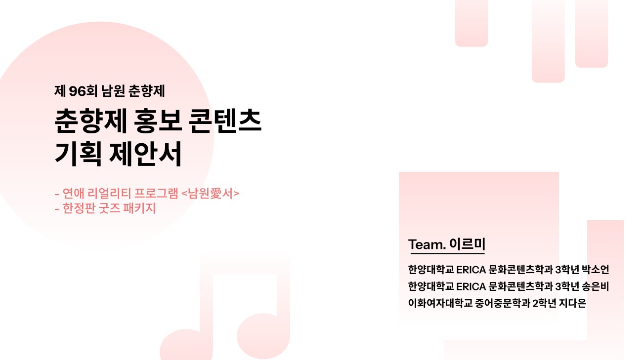 자유 『제96회 춘향제 홍보 콘텐츠 공모전』 홍보기획안-장려상 박소언 댓글 0건 조회 14회 작성일 26-03-12 16:19 『제96회 춘향제 공모전』 홍보 콘텐츠 공모전(홍보기획안) 장려상을 공개합니다! 전통과 현대가 어우러진 아름다운 남원~✨ 댓글 0 등록된 댓글이 없습니다.